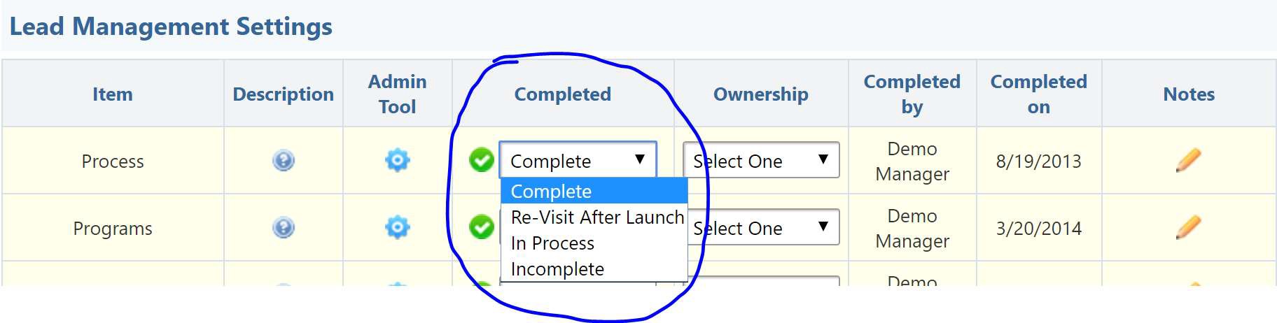 If there are multiple people working your check list together, you can assign users to each task by using the “Ownership” column. You are also able to use the “Note” feature to save notes for everyone to see. CampusLogin staff will assign ownership to any items that they are completing for your school.